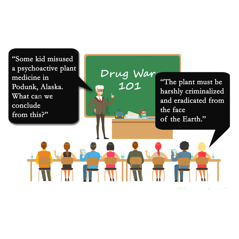 Alcohol can kill tens of thousands of Americans a year and we consider it a bargain price to pay for a little harmless fun. But if a demonized psychoactive plant from Mother Nature is merely REPORTED as being somehow related to one single solitary death -- one single solitary death -- the Drug Warrior considers it to be a knock-down argument that the plant medicine in question should be made unavailable, not just to Americans but to everyone around the world, including drug researchers studying Alzheimer's, and that we should even send our army overseas to burn those plants, no matter how many millennia they may have been used responsibly by other cultures.