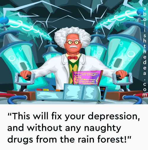 The cruelty of this modern reductive paradigm is seen in the way that psychiatrists "adjust meds." They insist that the severely depressed patient get off one drug entirely before starting another. Imagine if a drug dealer insisted on the same thing. You would think that he was crazy. But the doctor knows best. He or she needs to be in total control of the variables, if only for insurance and regulatory purposes, and so it is for his or her convenience that the patient must go without anything during drug changes, thereby rendering them absolutely miserable.