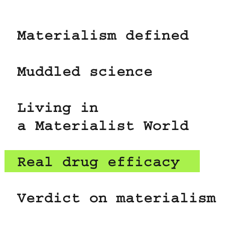 The fault here, strictly speaking, is not so much with materialists as such but rather with their refusal to follow the Baconian method to which they claim fealty, for Bacon told us to observe the world that we find around us rather than to limit our study to phenomena that seem to flatter our personal understanding of how the world should work. Materialists had presupposed, basically, that human beings were biochemical widgets and that their real motivations would be found under a microscope, where they would be susceptible -- at least in theory -- to dispassionate analysis and quantification. As such, they resolved to ignore the living, breathing human being when investigating the world around them and to establish the efficacy of psychoactive medicines by looking under a microscope instead.