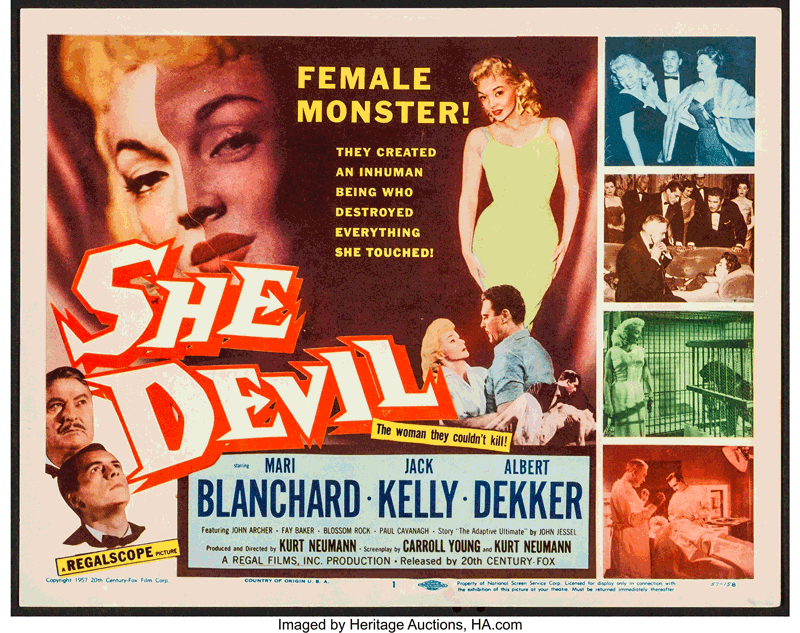 I watched one of those B horror movies from the 1950s last night. It was called "She Devil" and concerned a poor but attractive young lady who was suffering from an apparently incurable case of tuberculosis. An ambitious doctor gets wind of the case and submits the patient to a new untested drug treatment, with the reluctant help of his more cautious and elderly advisor and mentor. The drug restores the woman's health but has the unintended side effect of changing her erstwhile meek disposition into that of a heartless egoist, one determined to have her way in life no matter what.
