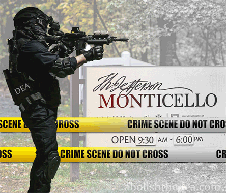 In 1987, the jackbooted DEA stomped onto Thomas Jefferson's estate of Monticello and confiscated the founding father's poppy plants in violation of everything that he stood for politically speaking. And yet the Thomas Jefferson Foundation pretends to this day that the raid never took place. They give no explanation to their visitors as to why the Foundation sold out the man whom they were meant to be honoring. And so all their visitors get a sanitized version of history, designed to let Americans feel that everything's fine, that there is no drug war, and life goes on. What an absolute disgrace, this so-called Thomas Jefferson Foundation. They should remove all the signs in Albemarle County that read "Hallowed Ground" -- because those grounds have been dishonored by the Foundation itself. THEY SOLD OUT THOMAS JEFFERSON -- and are now so pusillanimous and cowardly that they will not even admit that the raid ever took place -- a raid to confiscate flowers, for god's sake.