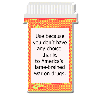 Incidentally, some Drug Warriors -- and even my own psychiatrist -- cite the pedantic difference between addiction and dependency, as if dependency is fine, only addiction is bad. Why? They say that addiction is problematic drug use -- but what could be more problematic than being stuck on a drug one dislikes and in place of which one wants to use time-honored godsend medicines instead? Besides, the problems caused for the addict are created by drug prohibition itself, which refuses to teach safe use, refuses to regulate drug supply and refuses to offer drug choice.