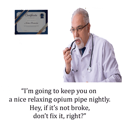 Of course, doctors should not have to prescribe opium . I am a big boy. I should be able to use it on my own without a prescription. That said, however, in a free world, any friend should be able to recommend the safe use of opium . Materialist doctors have no expertise in the subject of what actually works for people in terms of mind and mood. To the contrary, they have a mental block on the subject thanks to their adherence to the inhumane doctrine of behaviorism, which tells them to ignore all obvious emotional displays and just focus on quantifiable data.